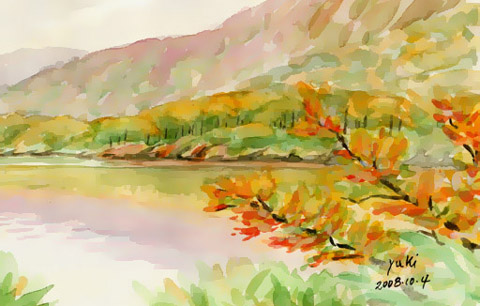 水彩スケッチは須川湖の秋