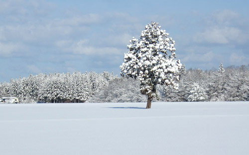 まっ白い雪の田んぼの中に一本の木がある