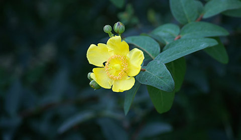 キンシバイの花は 本当に輝いているようだ 花言葉も明るい キンシバイの花は 時季は終わっているはずであるが 庭にまだ咲いていた〜 花ことばにつられてメロディをつくってみた〜 花言葉:きらめき、秘密、私は幸せです(撮影:2008/10/03)