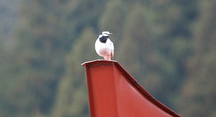 丁度その時に白い野鳥が建物の端に舞い降りた